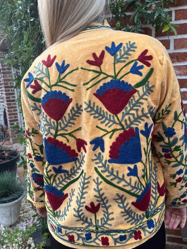 Sur une base safran chaleureuse, les broderies artisanales dévoilent une palette vibrante : fuchsia profond, rose vif, turquoise, vert olive… Une combinaison audacieuse qui apporte immédiatement style et lumière.